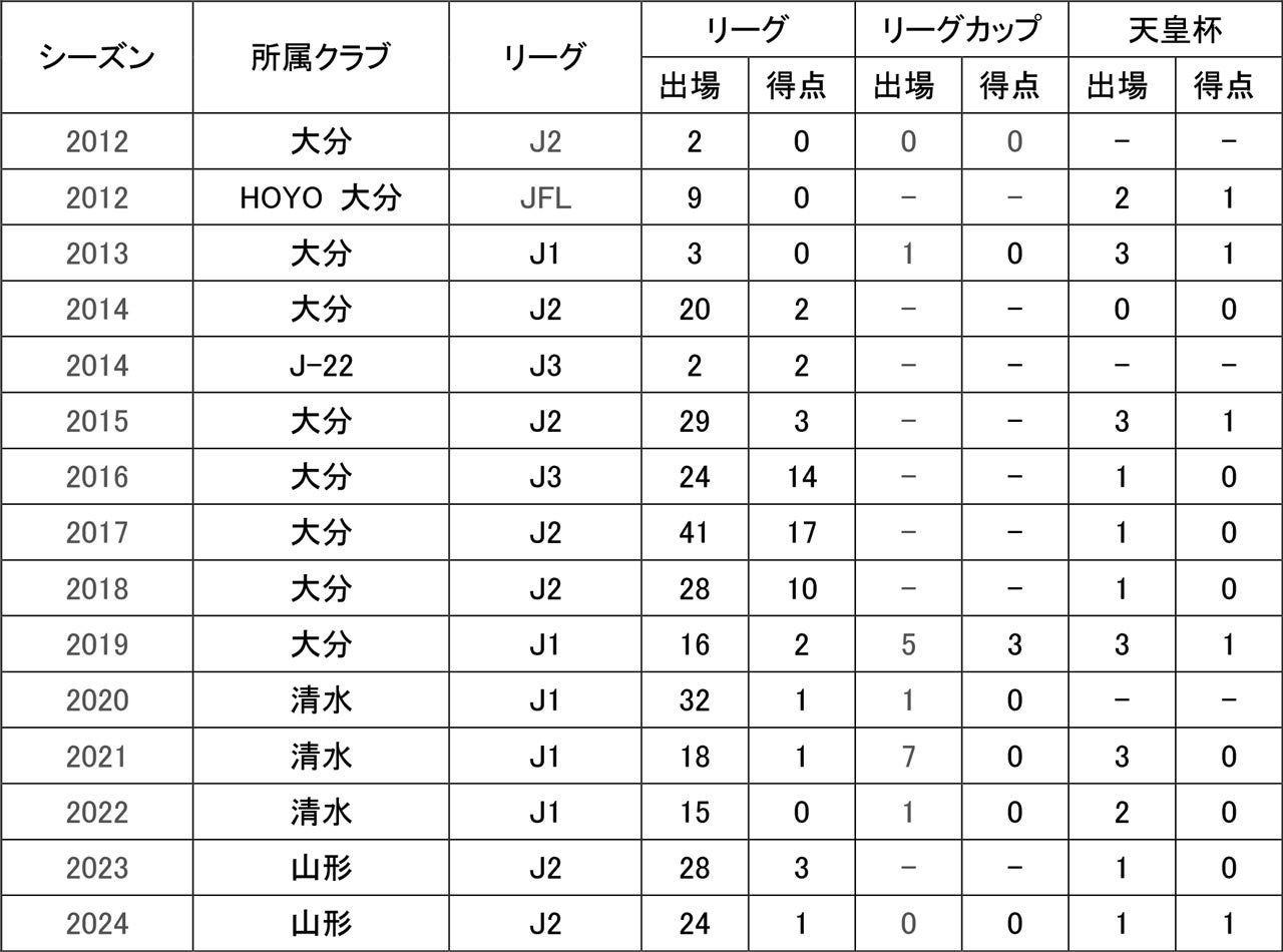 所属歴/鹿屋東中 – 大分トリニータU-18 – HOYO AC ELAN大分 – 大分トリニータ – 清水エスパルス – モンテディオ山形