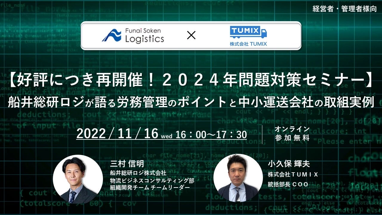 ロジスティクス・物流コンサルティングサービスを提供する船井総研ロジ株式会社(以下「船井総研ロジ」)のコンサルタント講演情報です。株式会社TUMIX様が主催するセミナー「【迫る2024年問題!】コンプライアンスと業務削減を実現したDX事例の紹介」にて、船井総研ロジのコンサルタントが中小運送会社におけるDX最新事例を解説しました。