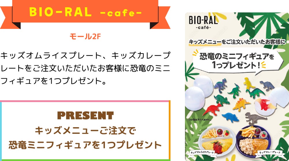 モール内の14店舗にて、期間限定のオリジナル恐竜メニューを販売いたします。