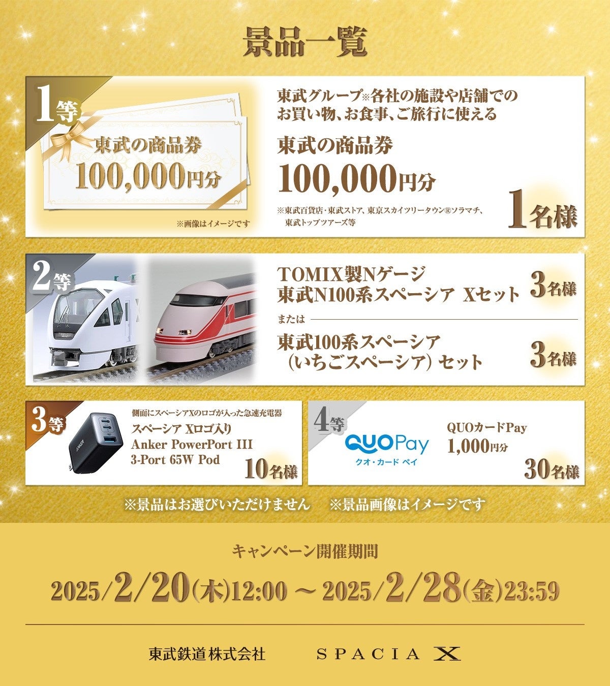 東武鉄道公式Xアカウントをフォローし、クイズに正解した方の中から抽選で、東武グル ープ商品券10万円分、TOMIX製Nゲージ(スペーシア Xまたはいちごスペーシア)や オリジナルグッズなどをプレゼントします。
