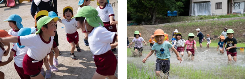 子どもたちの主体性を育むために「やりたいことを選べる」環境づくりを意識。子どもたちは登園してすぐに自ら選んだ遊びに取り組みます。園庭に子どもたちが遊べる仕掛けを用意し、手作りした輪っかと液でシャボン玉を楽しんだり、虫を捕まえて観察したり。近所の田んぼで思いっきり遊ぶことも。また、異年齢で交流する機会を多く設け、年齢を超えて関係性を築くことで社会性を育みます。