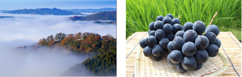 備中松山城の城下町として発展した高梁市。備中松山城は、日本三大山城の一つであり重要文化財に指定されています。雲海に浮かぶ絶景は、雲海展望台から9月下旬〜4月上旬にかけて見られることがあります。赤銅色の石州瓦とベンガラ色の外観で統一された町並み「吹屋ふるさと村」も歴史を感じる代表的なスポット。国の伝統的建造物群保存地区にも指定されています。また、高梁市の名産、ぶどうや桃の果物狩りは親子で楽しめる体験のひとつ。なかでも「ピオーネ」は名産品で、高梁市内の農園で9月〜10月中旬頃に収穫体験ができます。