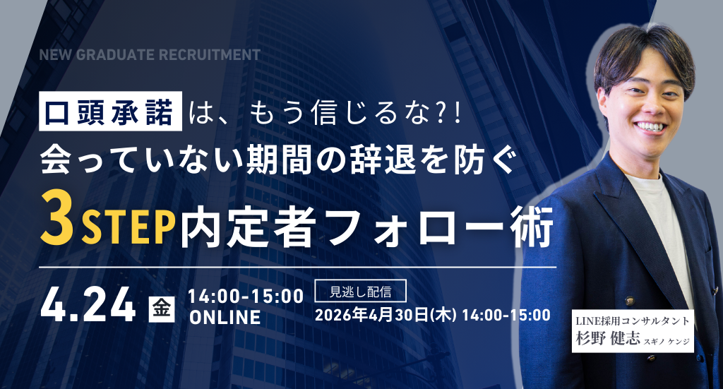 内定承諾後の辞退を「仕方ない」で終わらせない!大手への流出や心変わりを防ぐための3ステップを伝授。連絡頻度や言動から辞退の兆しを察知し、先手を打つための具体的なフォロー術が学べるセミナーです。