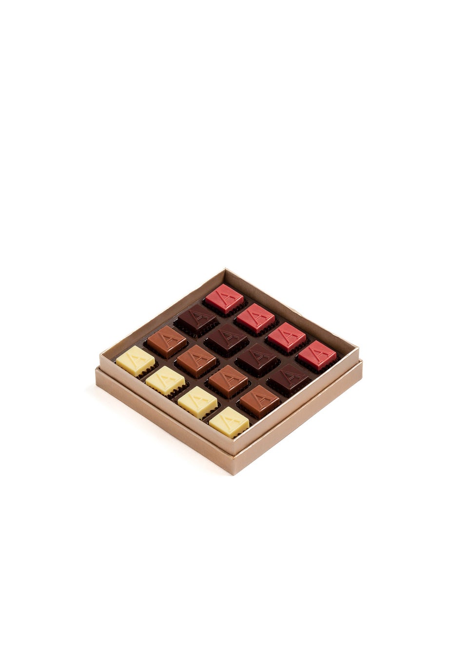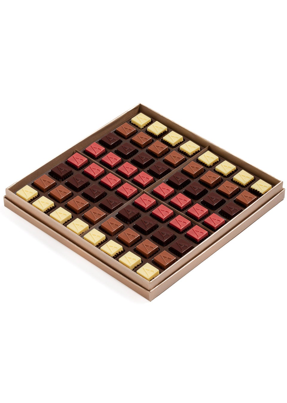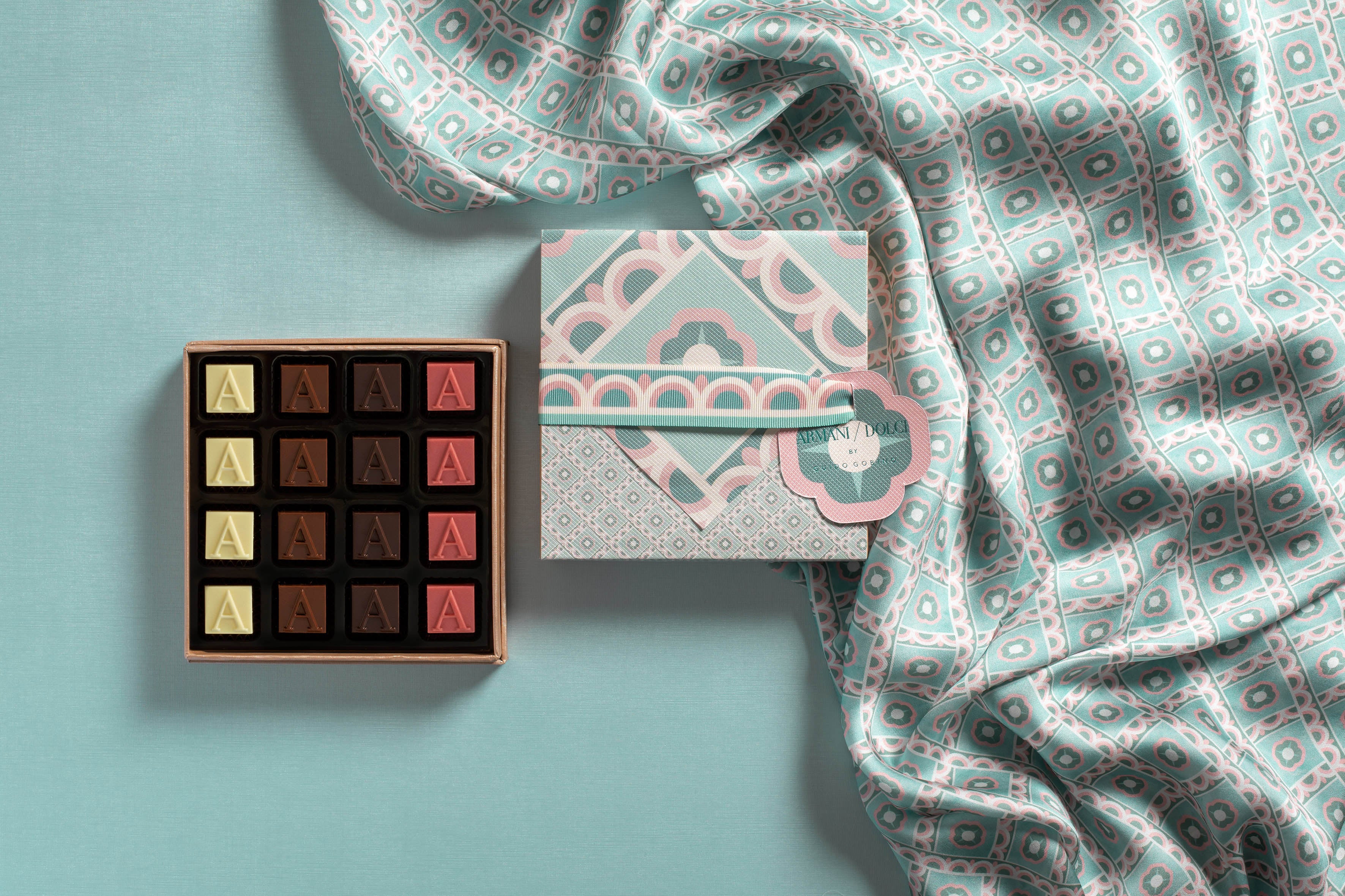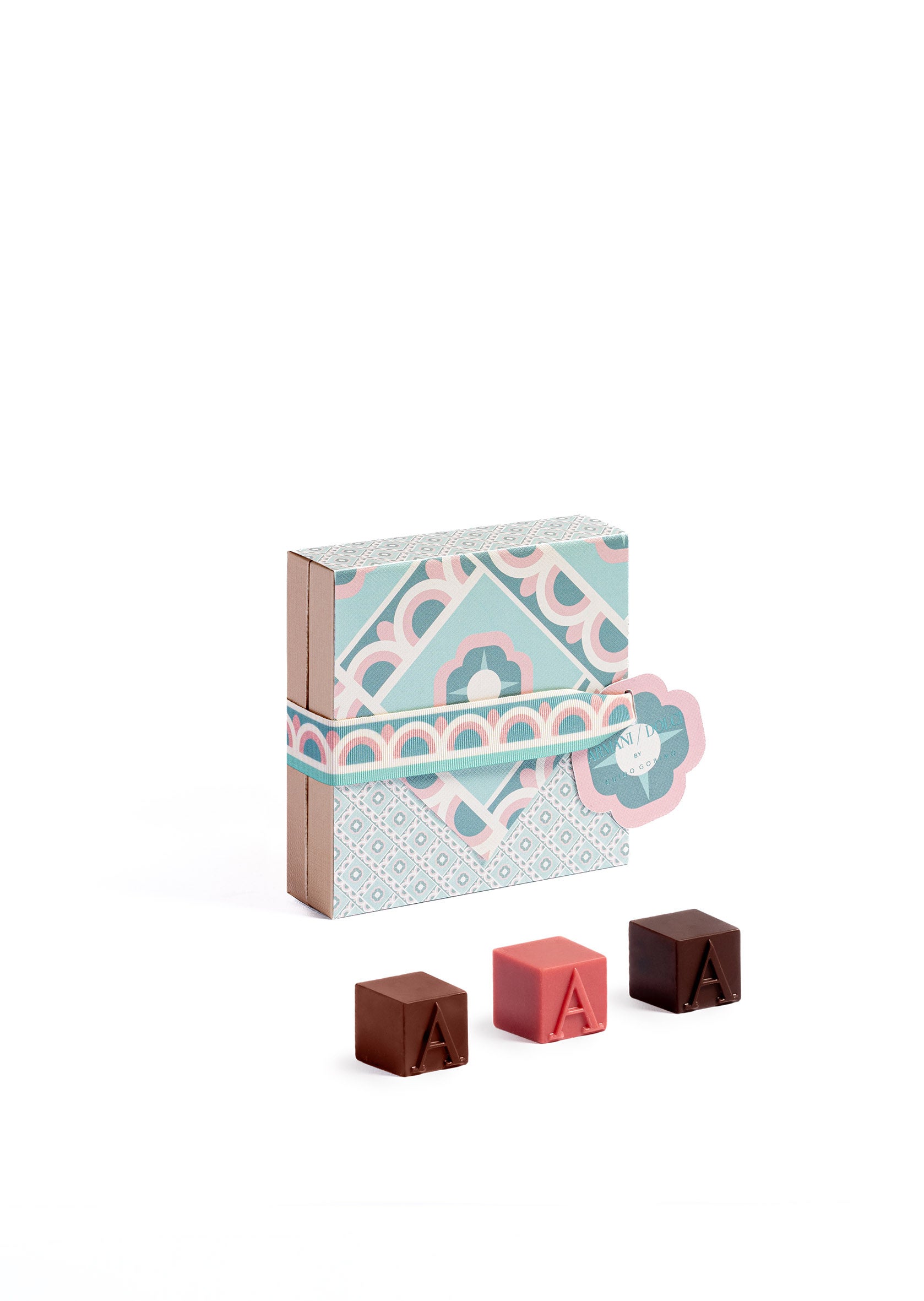 特別にデザインされた限定パッケージは、アラブの幾何学模様のような、花を思わせる柔らかな色合いの美しさが際立ちます。また、同じく幾何学的モチーフがプリントされたグログランリボンと、ジオメトリックな花の形をしたパーソナライズタグがアクセントになっています。16個、36個、64個入りのボックスからお選びいただけます。
