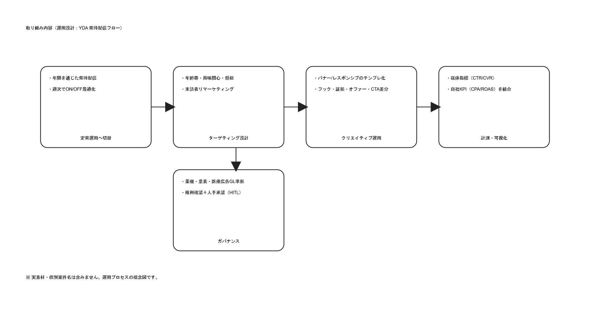 ・定常運用へ切替:年間を通じた常時配信+週次検証(面/訴求/クリエイティブ差分)