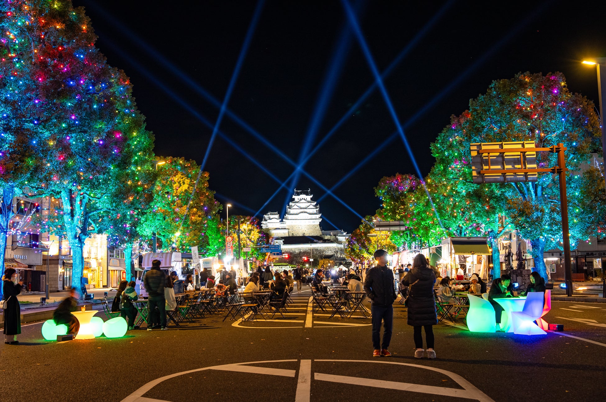昨年に引き続き、イルミネーション期間中の一部期間に大手前通りの一部(国道2号から城南線まで)を歩行者天国にすることにより、道路の真ん中で姫路城とイルミネーションを同一視野で楽しむことができる非日常空間を創出します。