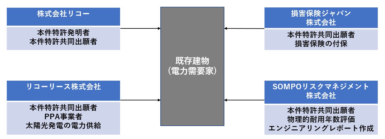 本取組みにおいて、SOMPOリスクは既存建物の物理的耐用年数を評価・算出し、損保ジャパンは残存期間が一定年数以上の建物に対し、物損害リスクや売電収入の減少リスク、賠償責任リスクなどをカバーする保険を提供します。リコー、リコーリースが今まで提案できなかったマーケットへ物理的耐用年数ソリューションを活用し、損害保険を提供することで根拠に基づく投資判断が可能となり、安心・安全を提供し、さらなる再生可能エネルギーの普及を後押しします。