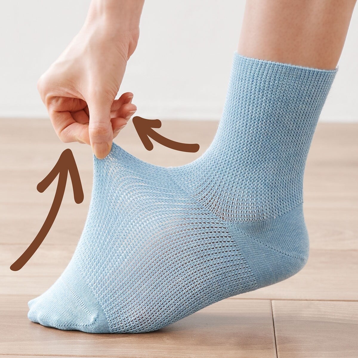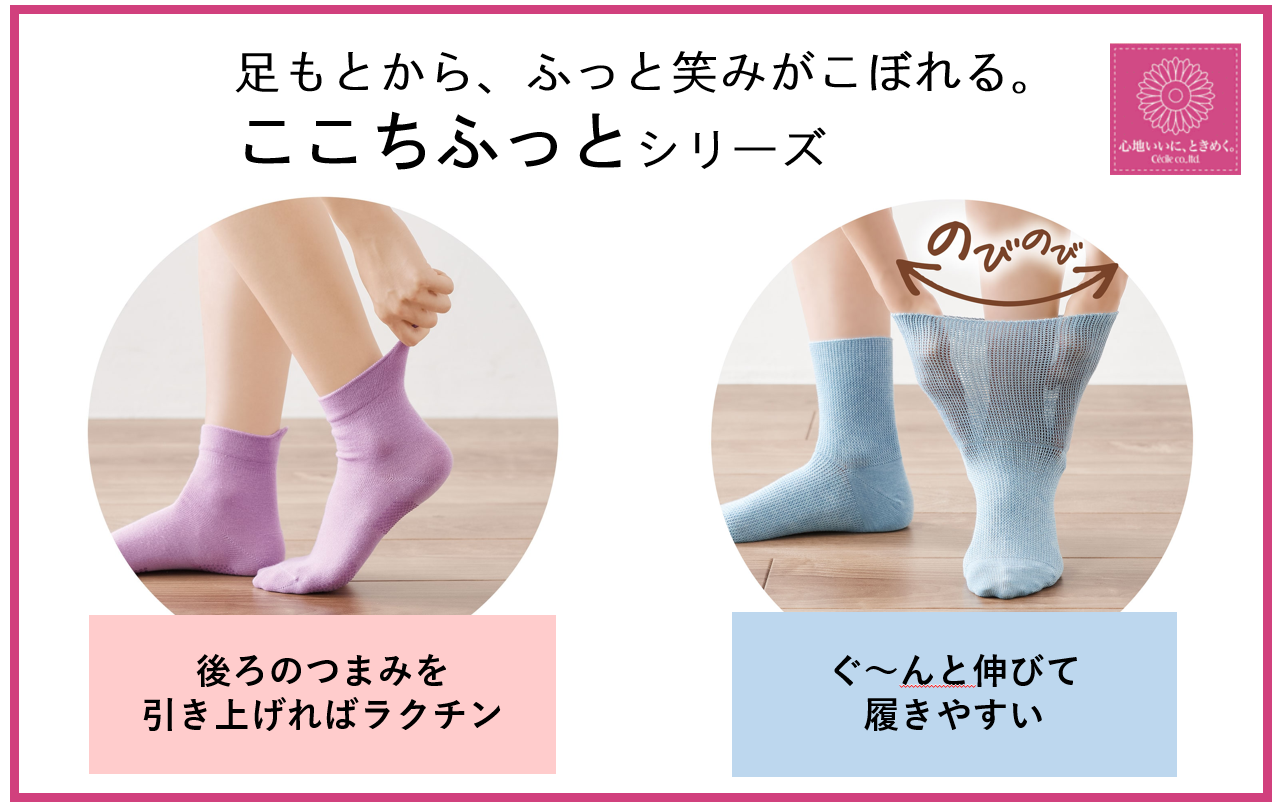 特に「着脱のしやすさ」に注目し、靴下を履く時のわずらわしさを少しでも軽減するために、後ろ側につまみを付けて引き上げやすくしました。