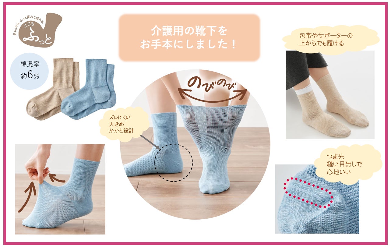 特に「とことん締め付けない」という点に注目し、介護用靴下をお手本にしました。