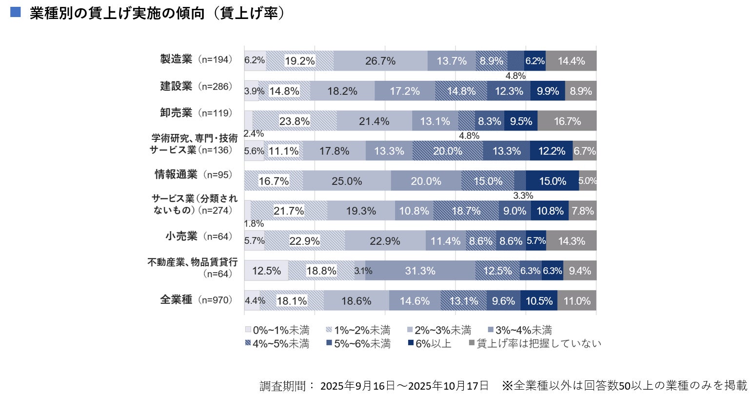 まず、業種別での調査では上位2つを占めた製造業、建設業の実施率が高かったが、その2業種の賃上げ率を見ると、建設業は相対的に高かったものの、製造業は4%未満の低い企業が多かった。