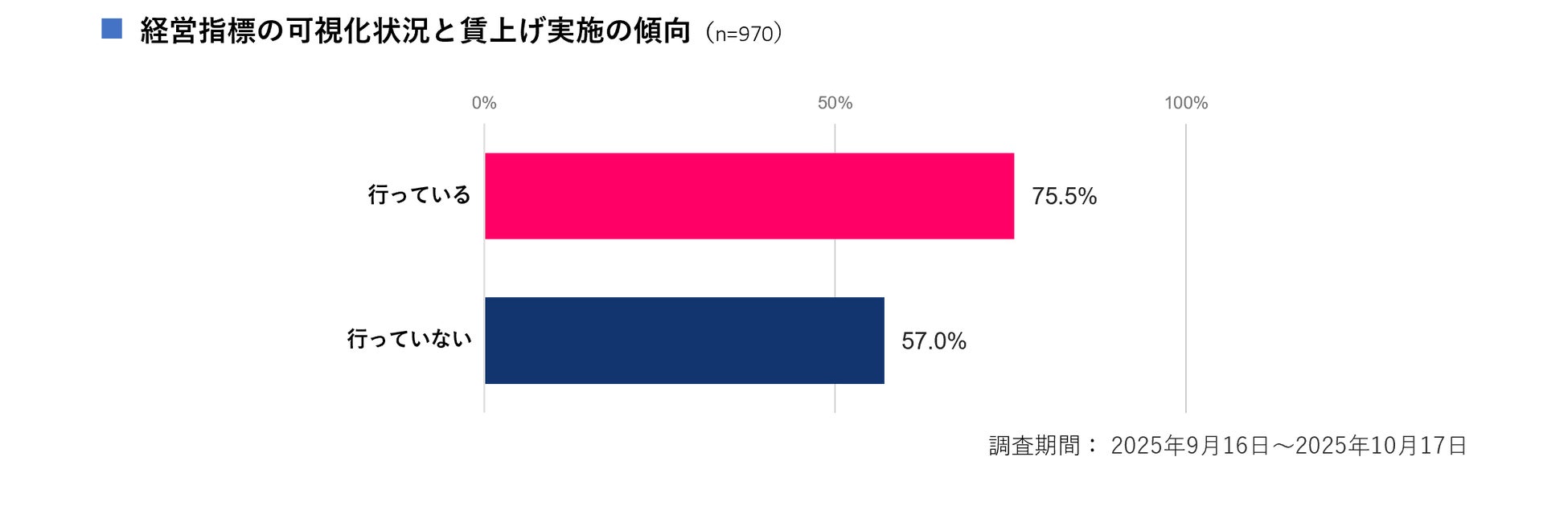 ・会社の経営指標(売上、利益、コスト構造、KPIなど)の可視化を「行っている」と回答した企業の賃上げ実施率は75.5%、可視化を「行っていない」と回答した企業の賃上げ実施率は57.0%と可視化を行っている企業のほうが18.5%の高かった。