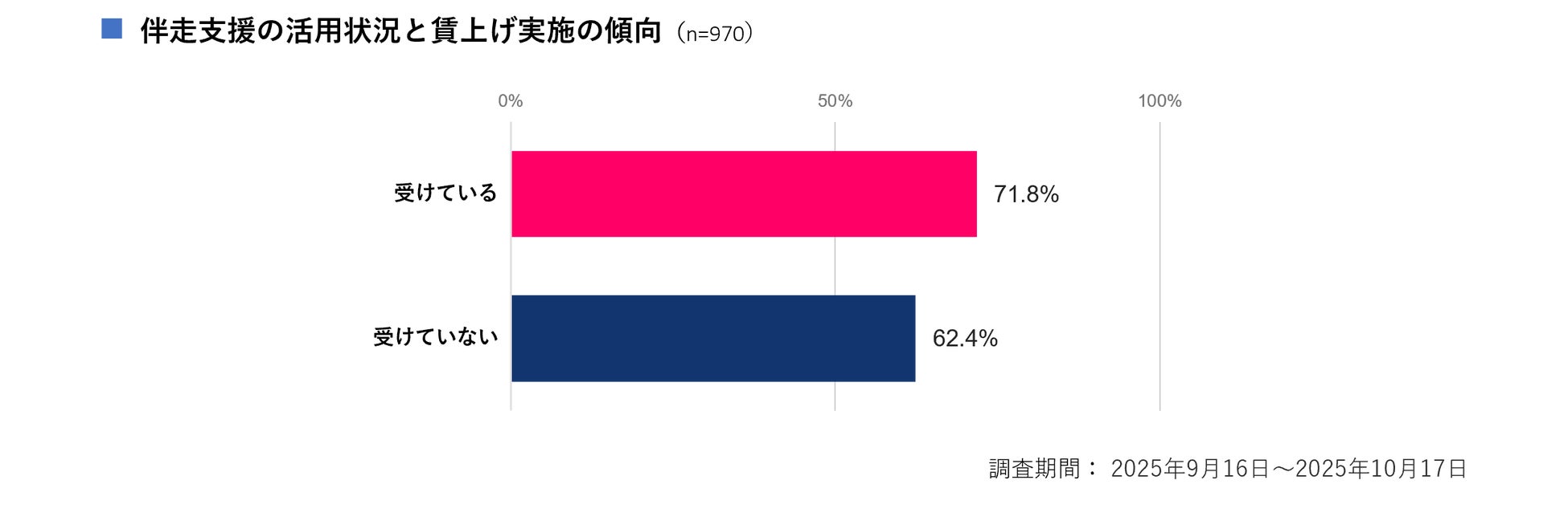 ・外部の専門家からの経営に関する伴走支援の有無による賃上げ実施状況についての調査に関しては、外部の専門家の伴走支援を「受けている」と回答した企業の賃上げ実施率は71.8%、伴走支援を「受けていない」と回答した企業の賃上げ実施率は62.4%と、外部の専門家に支援してもらう領域は企業によって様々だが、賃上げ実施にも影響を及ぼしている可能性がある。