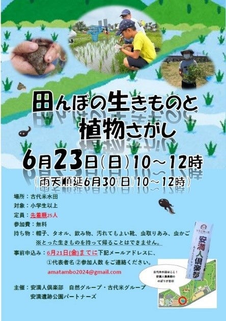 令和6年6月23日(日曜日)、安満遺跡公園で、同公園で活動するボランティアグループ安満人倶楽部主催の「田んぼの生きものと植物さがし」を開催。水田に生息する生き物や植物観察を楽しめるイベントにぜひご参加ください。