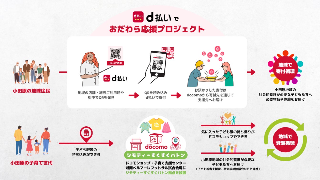 本協定では、ドコモのスマートフォン決済サービス「d払い®」を活用したキャッシュレス募金(以下、「d払い」募金)や、「ジモティーすくすくバトン(※1」を活用した子ども服などの回収・配布による地域の子どもの育成を応援する施策「おだわら応援プロジェクト」に取り組みます。