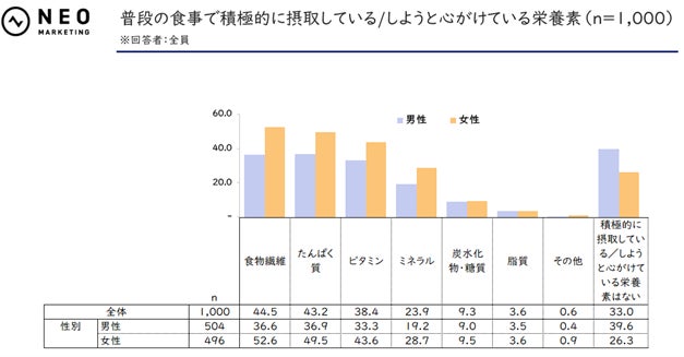 普段の食事で積極的に摂取している/しようと心がけている栄養素(n=1,000)