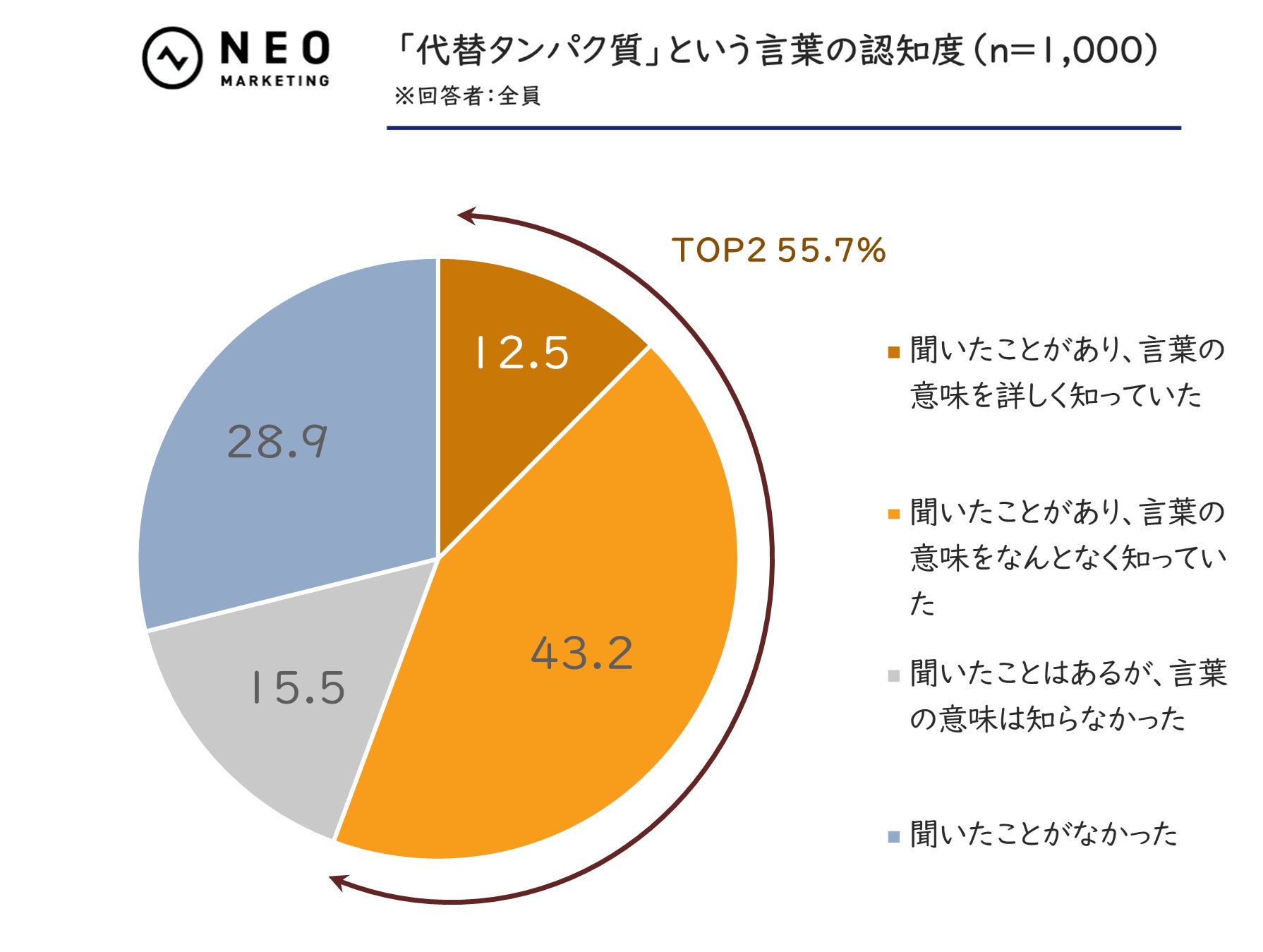 全体の結果を見ると、「代替タンパク質」という言葉の意味合いを認知していた割合(「聞いたことがあり、言葉の意味を詳しく知っていた」「聞いたことがあり、言葉の意味をなんとなく知っていた」の合算)は55.7%と半数を超える結果となりました。
