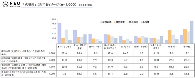 特に植物由来の代替肉は「身体によさそう」というイメージを、半数近くの42.4%の割合で抱かれており、さらに「タンパク質が豊富」「おいしそう」というイメージもそれぞれ28.4%・14.8%と、4つの代替肉のうち最多の票を集めています。