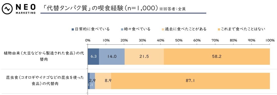 一方、昆虫食(コオロギやイナゴなどの昆虫を使った食品)の代替肉の喫食経験率は全体でわずか12.9%にとどまりました。