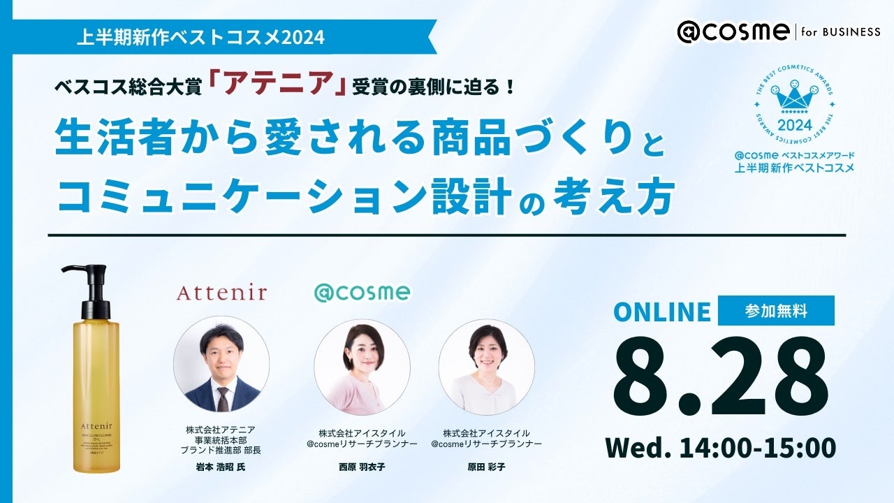 株式会社アイスタイル(代表取締役社長:遠藤 宗)は、2024年8月28日(水)に、ウェビナーイベント『ベスコス総合大賞「アテニア」受賞の裏側に迫る!生活者から愛される商品づくりとコミュニケーション設計の考え方』を開催することをお知らせいたします。