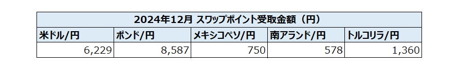 SBI FXトレード株式会社(本社:東京都港区、代表取締役社長:藤田 行生)は、2024年12月のスワップポイントの実績を公表しましたことをお知らせいたします。