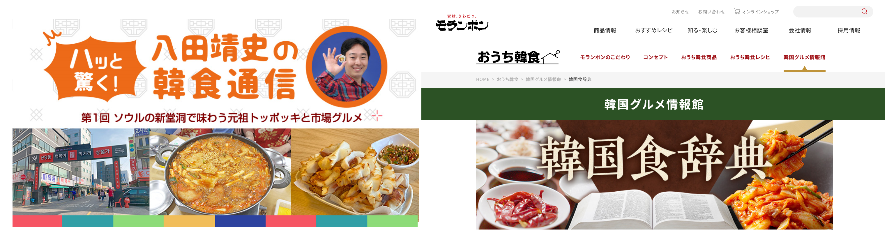 韓国関連の商品・情報・ノウハウを集中させ、食の情報基地となる「おうち韓食サイト」を新設します。おうち韓食サイトでは、モランボンのこだわりやブランドのコンセプト、韓国料理の素、韓食レシピ、韓国グルメ情報館といったカテゴリーを展開します。韓国グルメ情報館では、コリアン・フード・コラムニスト八田靖史さんによるイマドキ韓国の情報発信のコラムをお届けします。また、韓国食辞典を強化して韓国の食に関する意味・用例などを説明するコンテンツも展開します。https://www.moranbong.co.jp/hanshoku/
