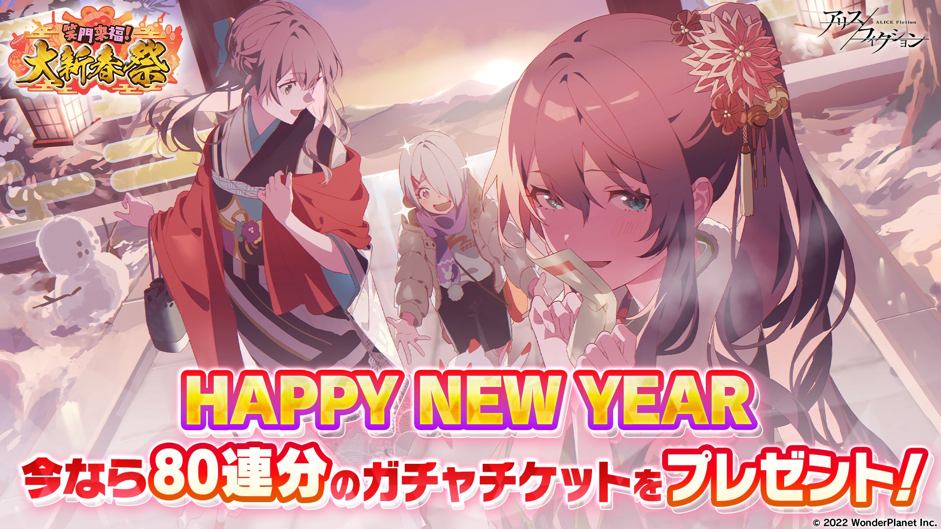 エンターテインメントサービス事業を行うワンダープラネット株式会社(本社:愛知県名古屋市、代表取締役社長CEO:常川友樹、東証グロース:証券コード4199、以下当社)は、好評配信中の新作スマートフォン向けゲーム『アリスフィクション』にて、1月1日(日)より初フェスを開始したことをお知らせいたします。