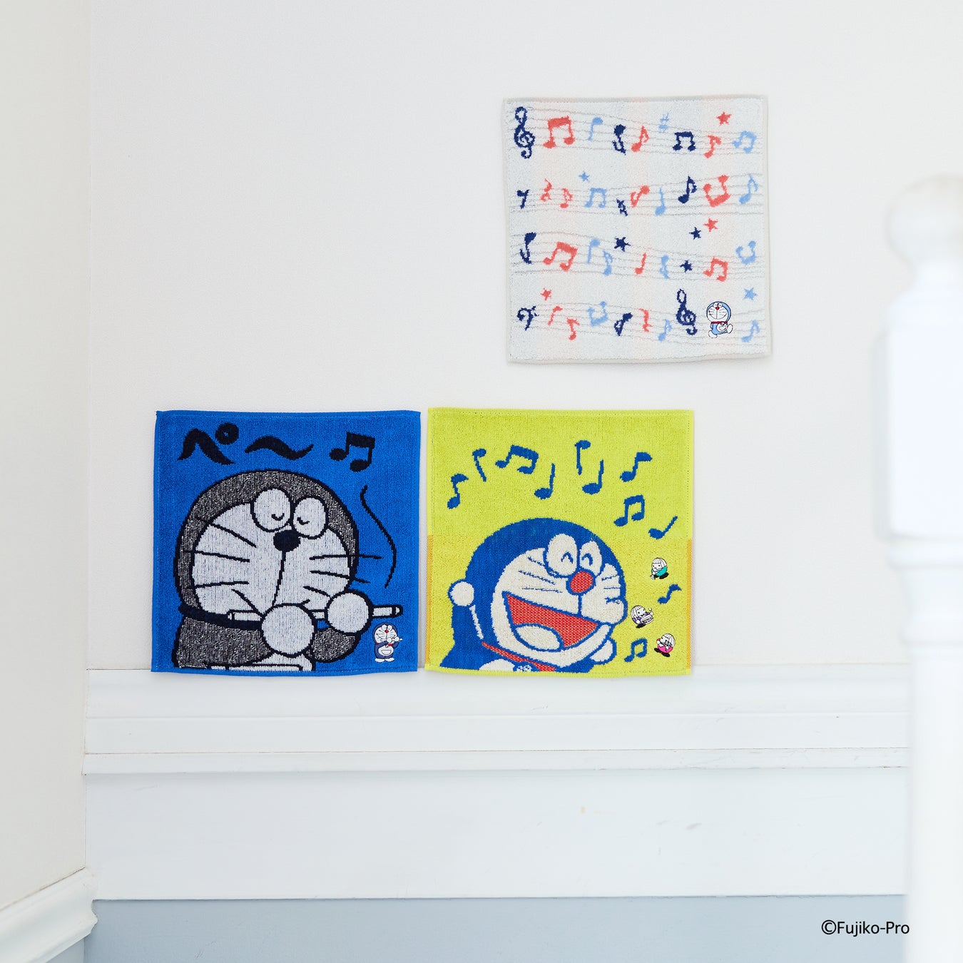 ドラえもんが、ひみつ道具の「コベアベ」を吹いたり、「ムードもりあげ楽団」と一緒にもりあがったり、五線譜の上をすまして歩いたり。どれもリズムを感じる楽しいデザインです。