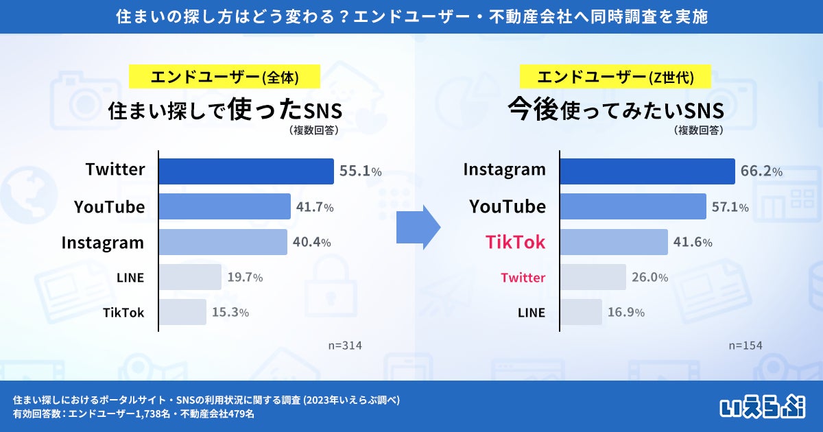 エンドユーザー全体が「住まい探しに使ったSNS」の1位はTwitter(55.1%)でしたが、Z世代が「今後住まい探しに使ってみたいSNS」ではTwitterは4位(26.0%)になり、3位にTikTok(41.6%)が浮上しました。この結果からも、今後の住まい探しで動画SNSの利用が増えていくことが予想されます。