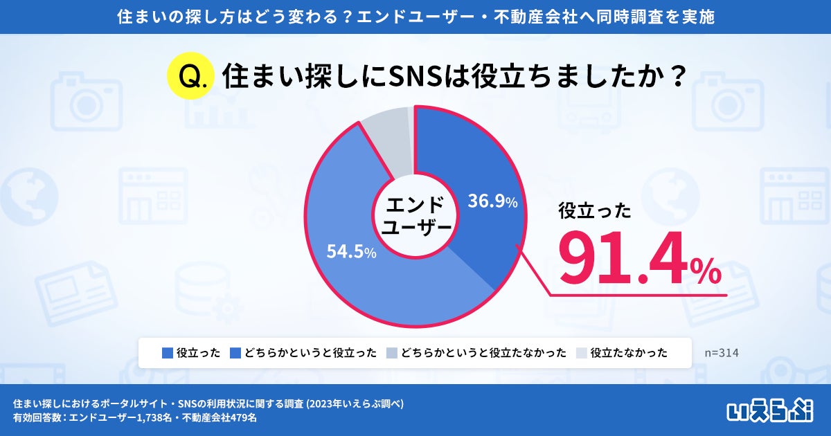 住まい探しにSNSを利用したエンドユーザーの91.4%が「SNSは役立った」と回答しています。また、SNS運用をしている不動産会社の76.0%が「SNS経由の反響を得たことがある」と回答しており、SNSの存在は無視できないものになっています。