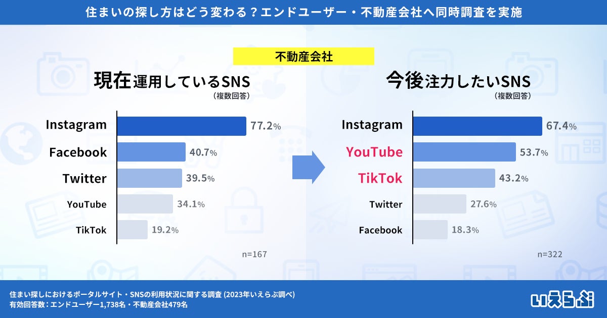 不動産会社が注力するSNSにも変化が起きています。現在運用しているSNSの2位、3位はFacebook(40.7%)、Twitter(39.5% ※4)でしたが、今後注力したいSNSの2位、3位はそれぞれYouTube(53.7%)、TikTok(43.2%)となりました。
