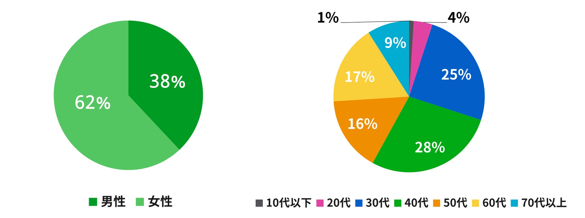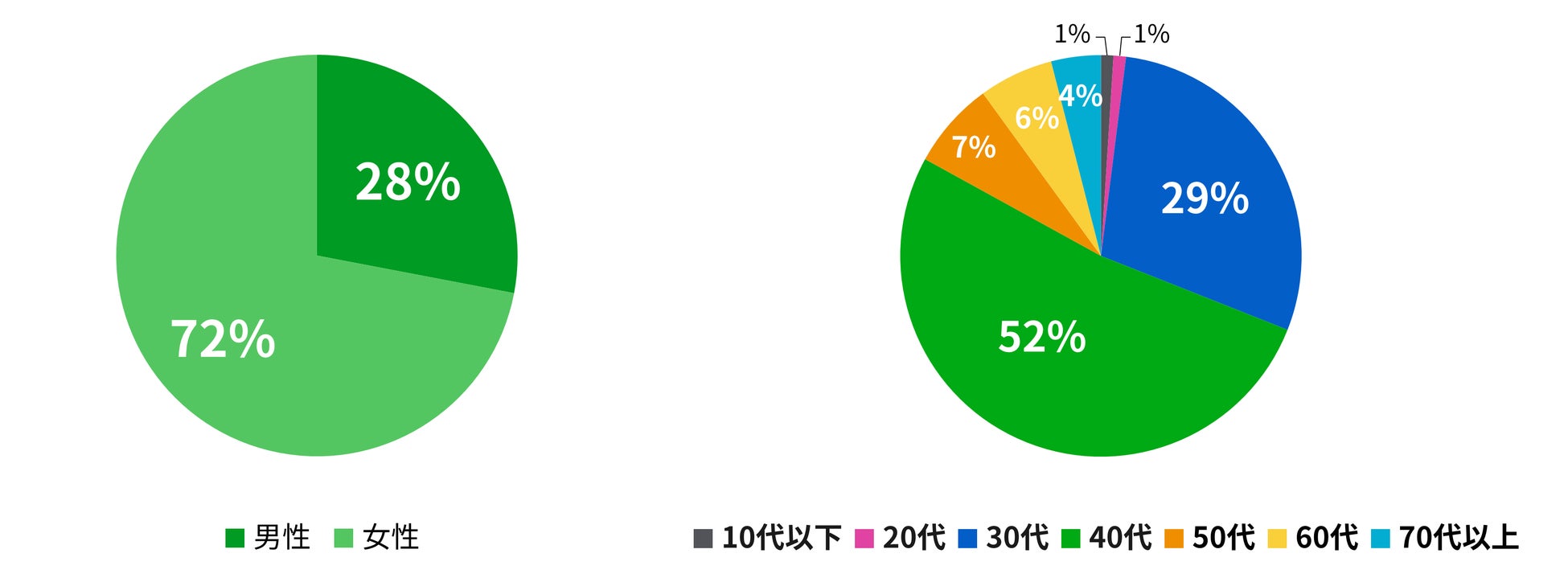 圧倒的に女性の割合が高く、年代別で見ると30代~40代が大部分を占めていることがわかりました。