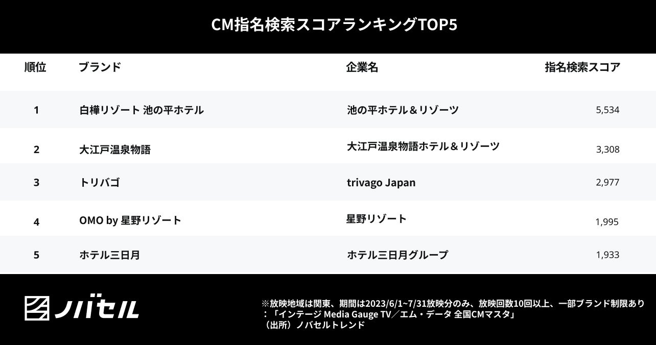 2023年6月1日~7月31日までに放送されたレジャー関連のテレビCMのうち、指名検索スコアが高かった上位5位までのランキングです。