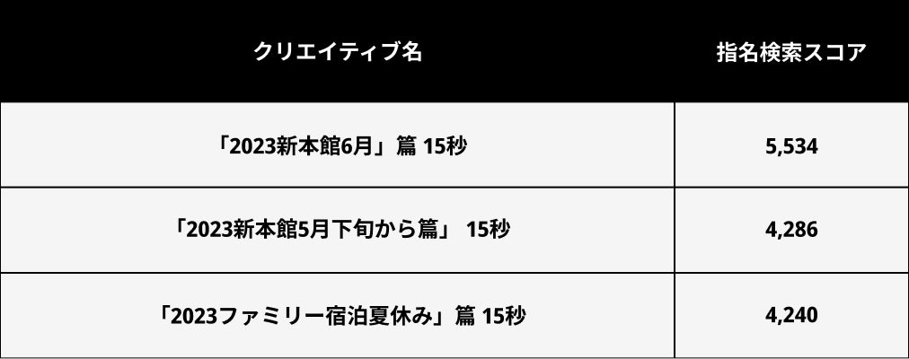 株式会社池の平ホテル&リゾーツでは、2023年6~7月にかけて合計9パターンのクリエイティブを放映。このうち特に高い指名検索スコアを獲得したCMは、以下の3バージョンです。