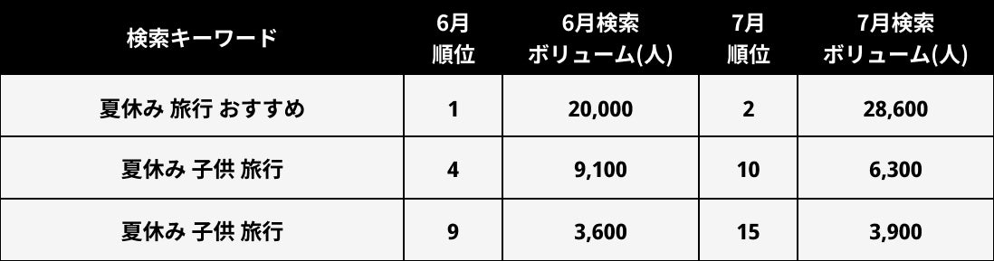 「夏休み」に関するキーワードは6月よりも7月の方が検索数が多いため、ランキング順位と検索ボリュームの大きさを合わせて比較することはできません。