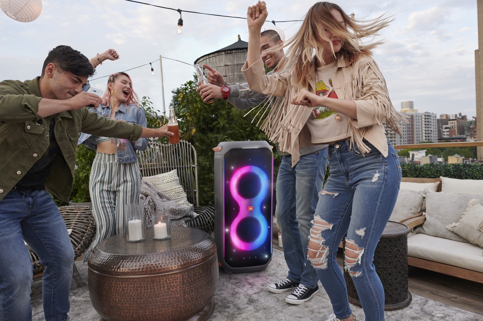 全部で172基のLEDライトを搭載し、華やかさだけでなく、解像度の高い滑らかで迫力のあるライトショーをお楽しみいただけます。ウーファーの外周を囲み、ボディの中心部に配置された8の字状のリングライトのほか、上部から前面を照らすストロボライト、星の瞬きのように輝きを放つスターリーライト、両端を線状に彩るクラブライトなど、重層的でインパクトあるライトエフェクトが特徴です。再生している音楽のビートに合わせた美しい光の演出により、視覚からも音楽を感じることができます。ライティングパターンは、本体の操作パネルで、5種類(ロック、ネオン、クラブ、フロー、リップル)からシーンや雰囲気に合わせてお選びいただけます。また、より細かい設定やライティングカラーは専用のスマートフォンアプリ「JBL PartyBox」より、お好みでカスタマイズいただけます。