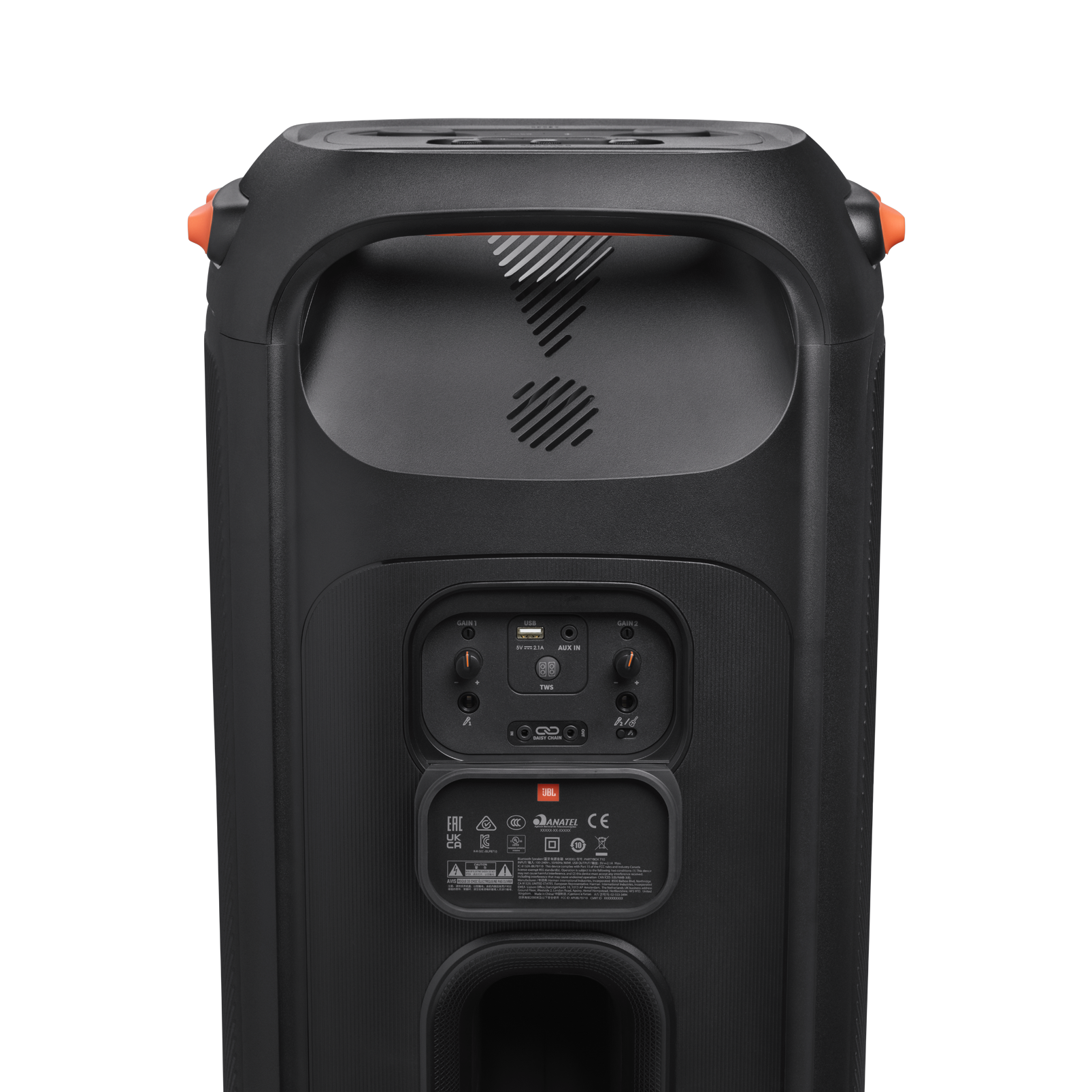 Bluetooth接続だけでなく、筐体の背面には、マイク入力やギター入力のほか、ステレオミニジャックと有線で複数台の「PartyBox 710」を接続できるデイジーチェーン入力/出力端子など、充実した入出力機能を施したリアパネルを搭載。また、USB給電にも対応しているため、スマートフォンやタブレットなどお手持ちのデバイスに給電しながら音楽再生をすることも可能です。