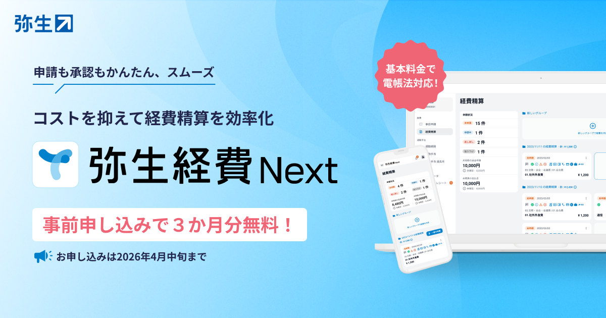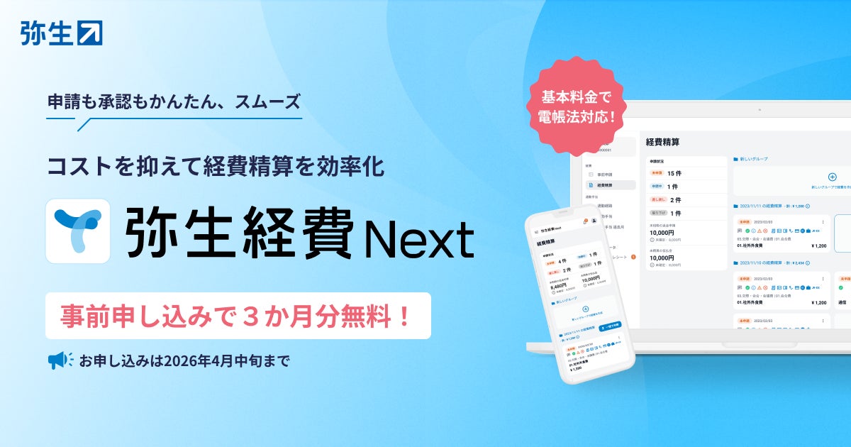 弥生株式会社(本社:東京都千代田区、代表取締役 社長執行役員 兼 CEO:武藤健一郎、以下「弥生」)は、2026年2月3日より、クラウド経費精算ソフト「弥生経費 Next」の単体販売における事前登録受付を開始したことをお知らせします。これまで、「弥生経費 Next」は法人向けクラウドサービス「弥生会計 Next」 とあわせて提供してきました。今回、単体でご利用いただける販売を開始することで、経費業務のみを導入したいお客さまにも柔軟にお選びいただけるようになります。 また、事前申し込みキャンペーンとして、期間中に申し込んでいただくことで基本料金が20%オフ、従量料金が3か月無償と、低コストで経費精算の効率化をすることができます。「弥生経費 Next」は2026年4月8日に単体での販売を開始する予定です。