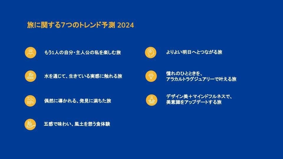 五感の刺激を研ぎ澄ます旅とは、温泉やスパ、緑に溶け込む体験など、自然の中で心身ともに癒す体験や現地との触れ合い、食体験などを堪能する旅のことです。「水を通じて、生きている実感に触れたい」、「マインドフルネスで美意識をアップデートしたい」、「五感を味わってその土地ならではの食体験がしたい」といった今年の旅行トレンドも反映されているのがわかります。