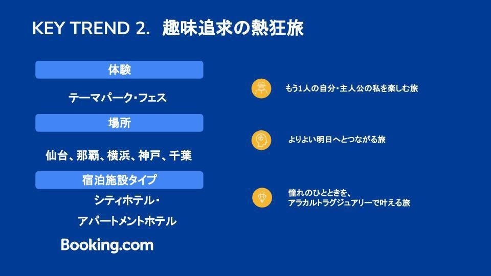 こうしたなか、ブッキング・ドットコムの日本人ユーザーの検索結果データから、旅行場所の意向として海外旅行が10%に対して国内旅行が90%になっており、今年のGWは海外よりも国内旅行を楽しむ旅行者が多くなると予測していると述べました。また、今年のGWは特に「五感の刺激を研ぎ澄ます旅」と「趣味追求の熱狂旅」の2つがキートレンドになると説明しました。