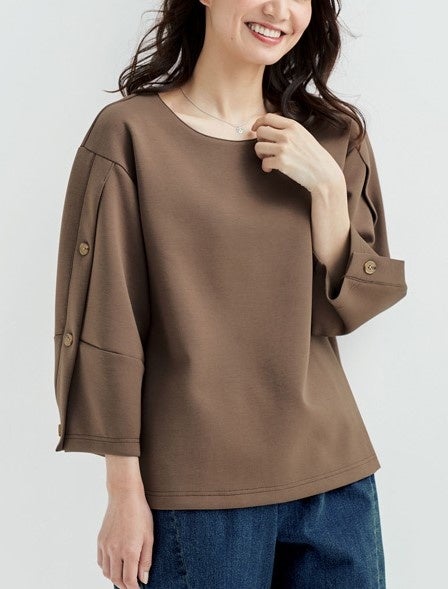 ■特長:環境に配慮したリサイクルポリエステルを80%以上使用した、なめらかなカットソー素材のプルオーバー。立体シルエットでこなれ感を演出。重ね着アレンジも自由自在です。
