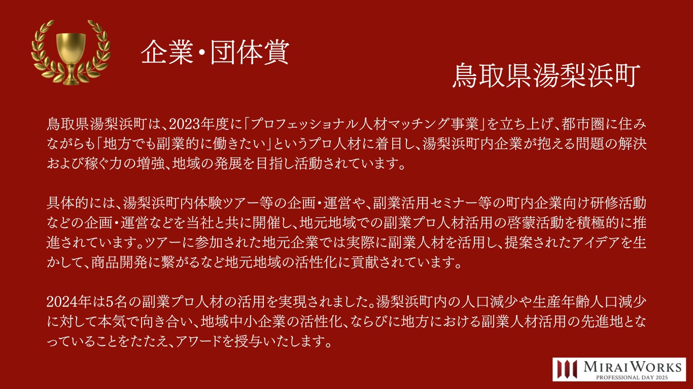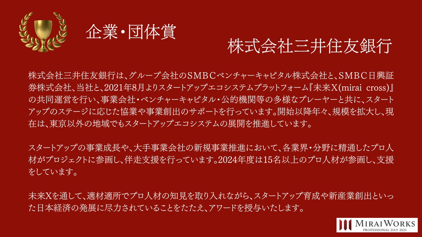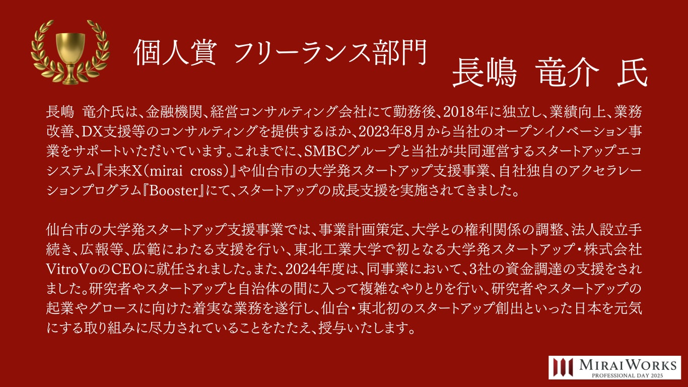 株式会社みらいワークス(本社:東京都港区、代表取締役社長 岡本祥治、以下「当社」)は、「プロフェッショナル アワード」の2024年受賞者を決定し、授賞式を執り行いました事をお知らせいたします。