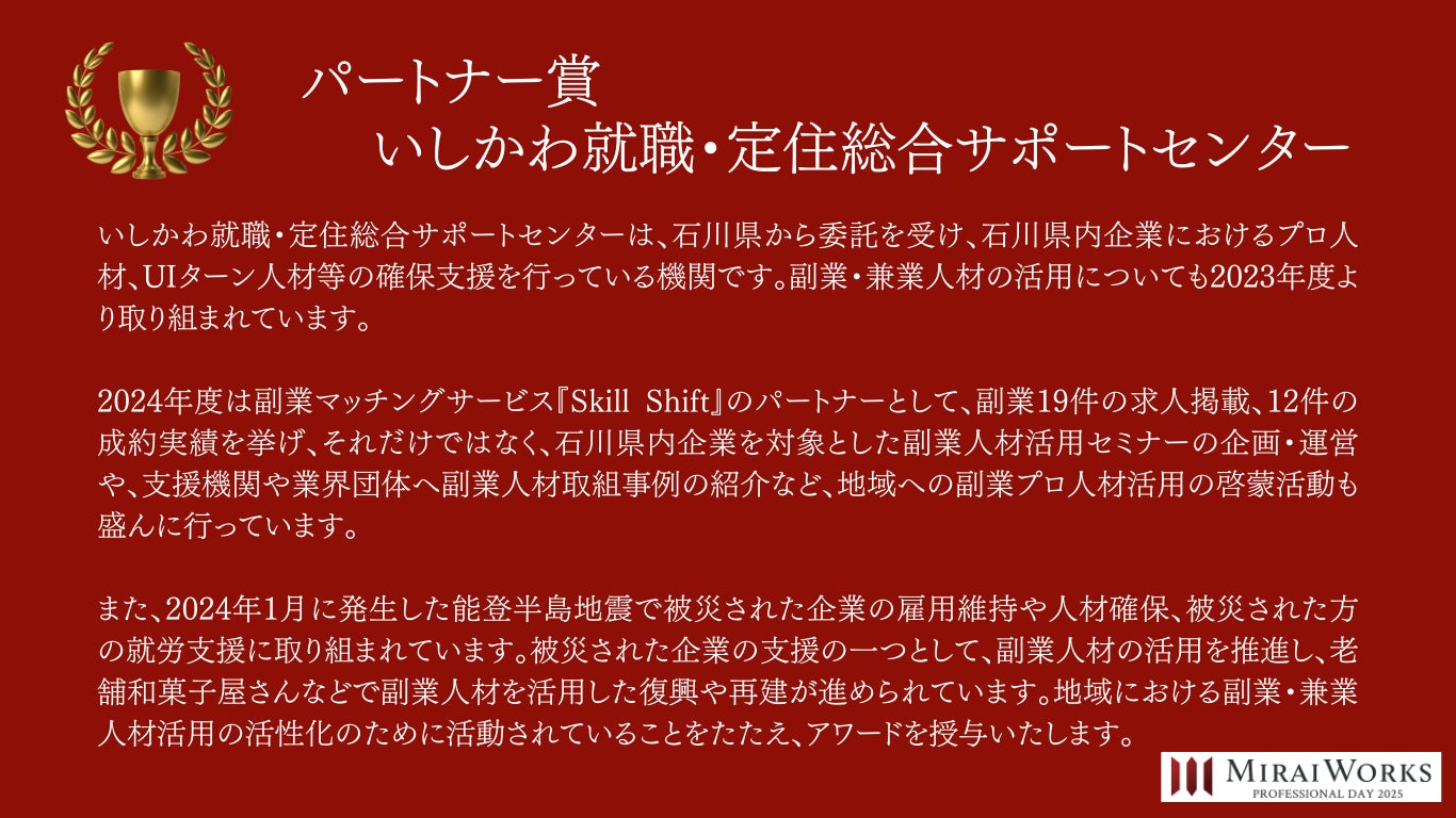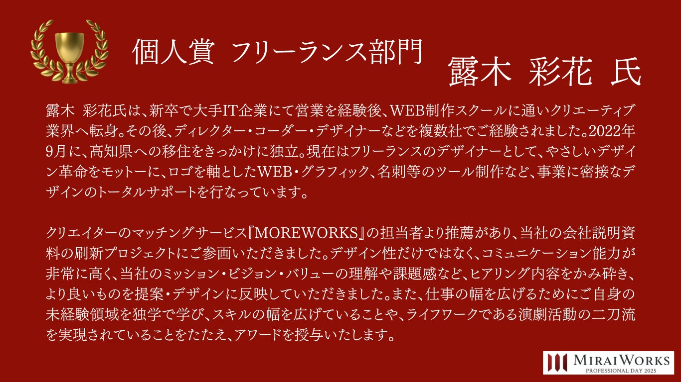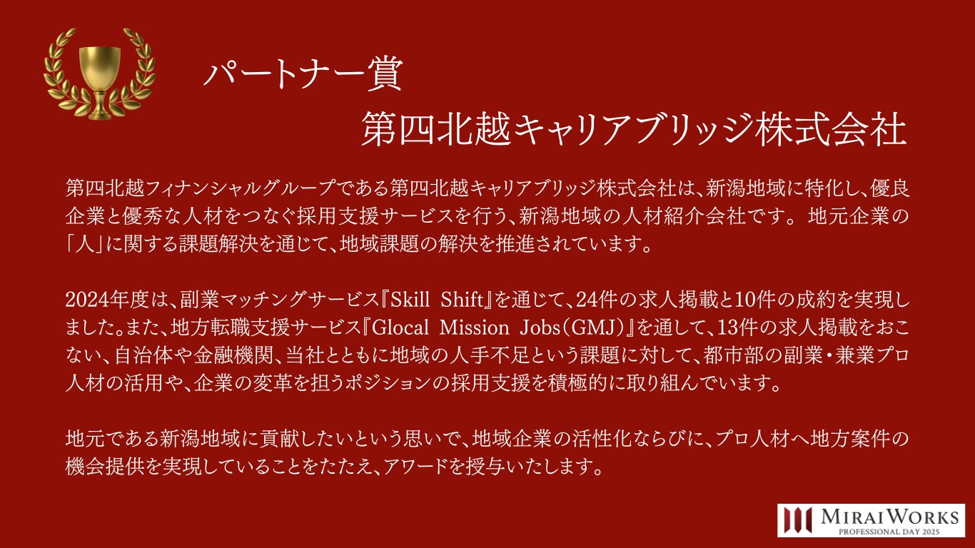 株式会社みらいワークス(本社:東京都港区、代表取締役社長 岡本祥治、以下「当社」)は、「プロフェッショナル アワード」の2024年受賞者を決定し、授賞式を執り行いました事をお知らせいたします。