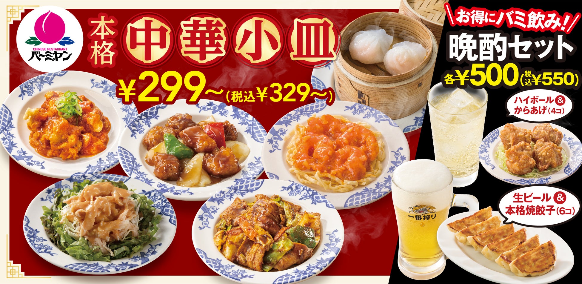| 【 バーミヤン 『本格中華小皿』 ポイント 】 ①【税込329円~】本格中華小皿がズラリ!春のグランドメニュー改定 「エビチリ」や「黒酢豚」など、あと一皿!にちょうどいいサイズでご提供する小皿メニューです。 ②多様な利用シーンに対応!飲み会やパーティ、ちょこっと食べにおすすめ! ランチやディナー、ちょい飲みのほか、おひとり様でも大人数でも幅広くお楽しみいただけます。 ③バミ飲みの乾杯は、お得な“税込550円の晩酌セット”か“ボトルキープの焼酎”で! 「ハイボール&からあげ」または「餃子&ビール」を選べるセットメニュー。ボトルキープはココだけ価格。 |