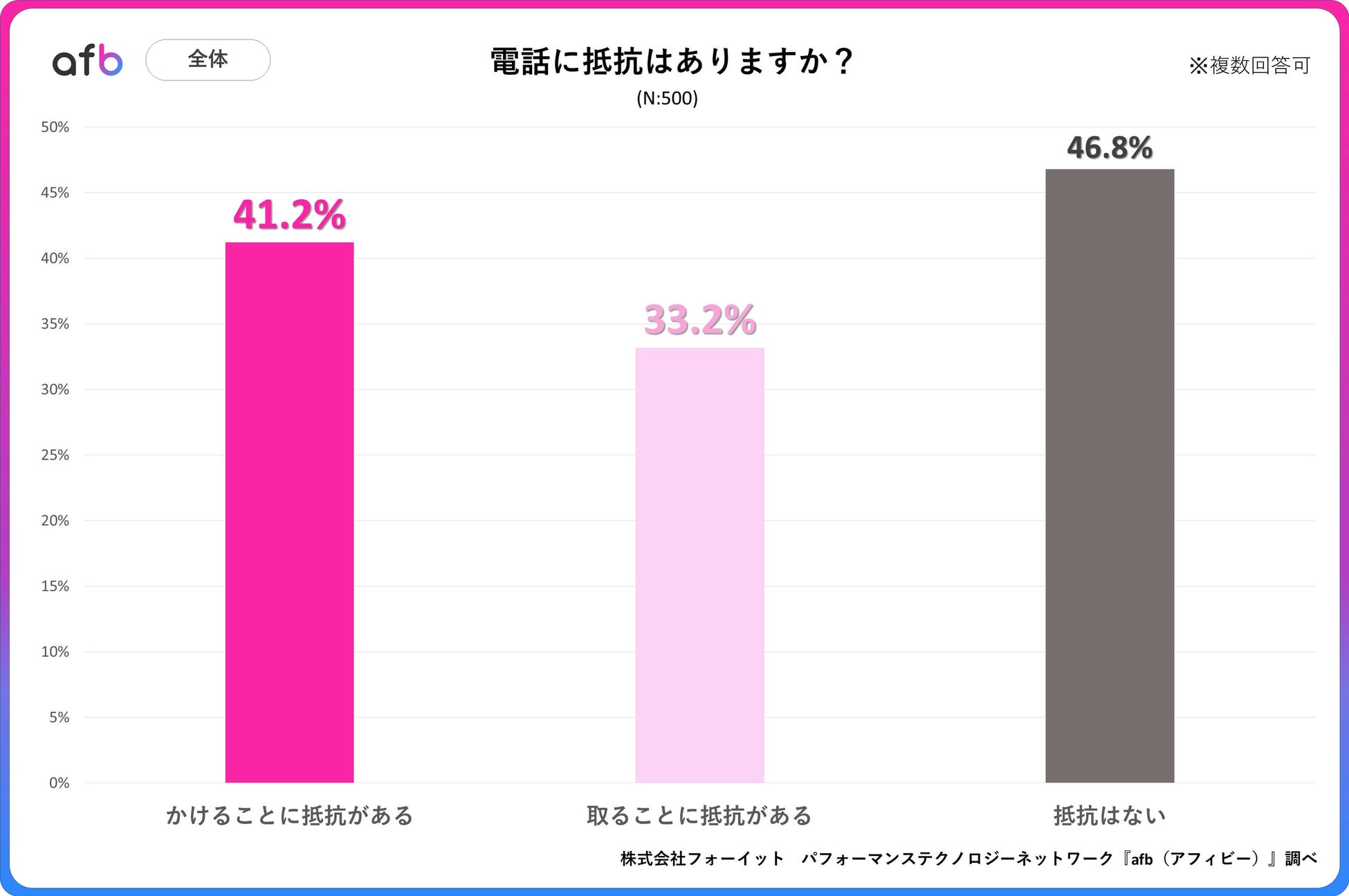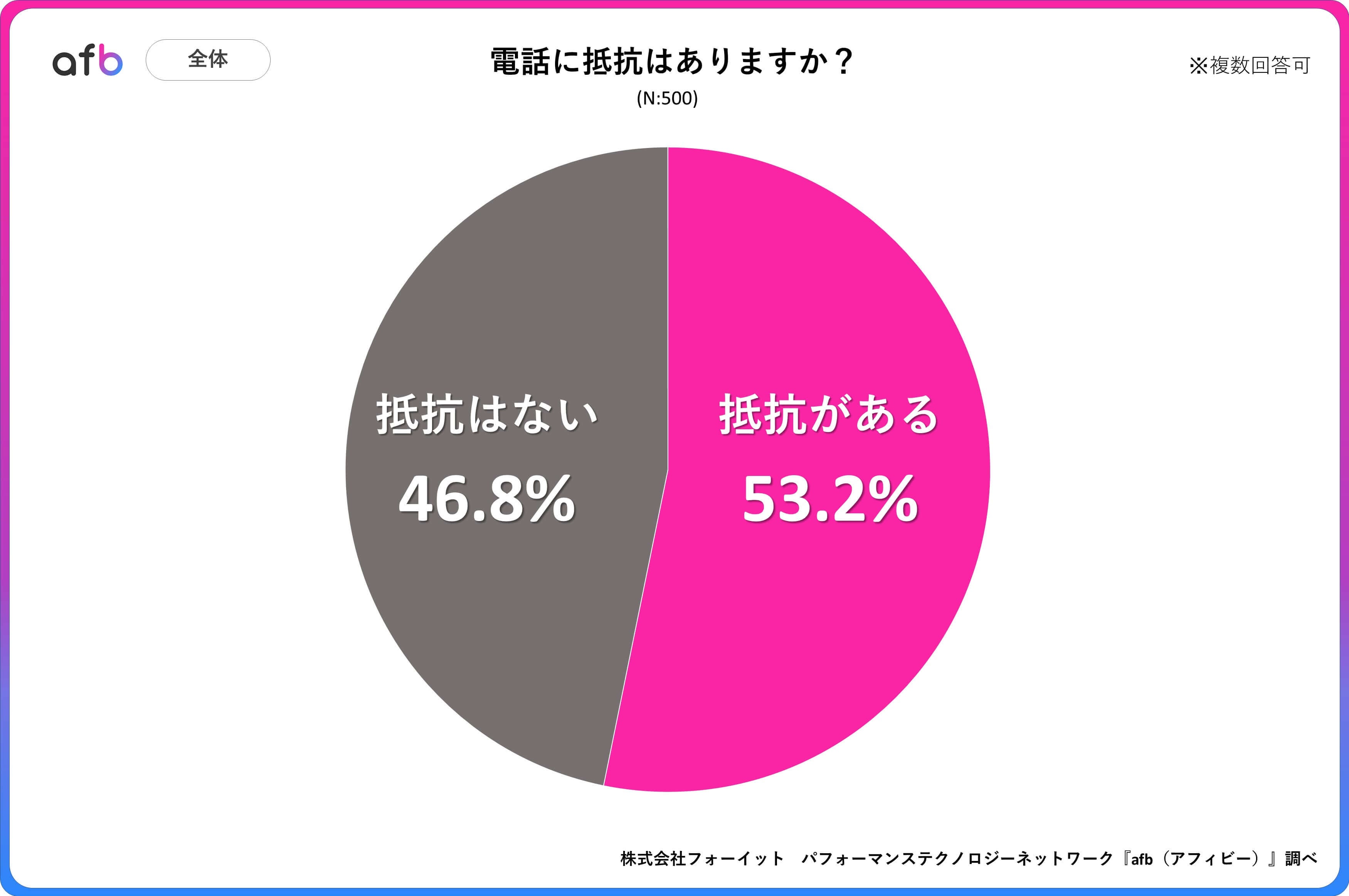 全国の20代〜60代の男女を対象に、「電話に抵抗はありますか?」というアンケートを実施したところ、「抵抗がある」が53.2%、「抵抗はない」が46.8%という結果になりました。