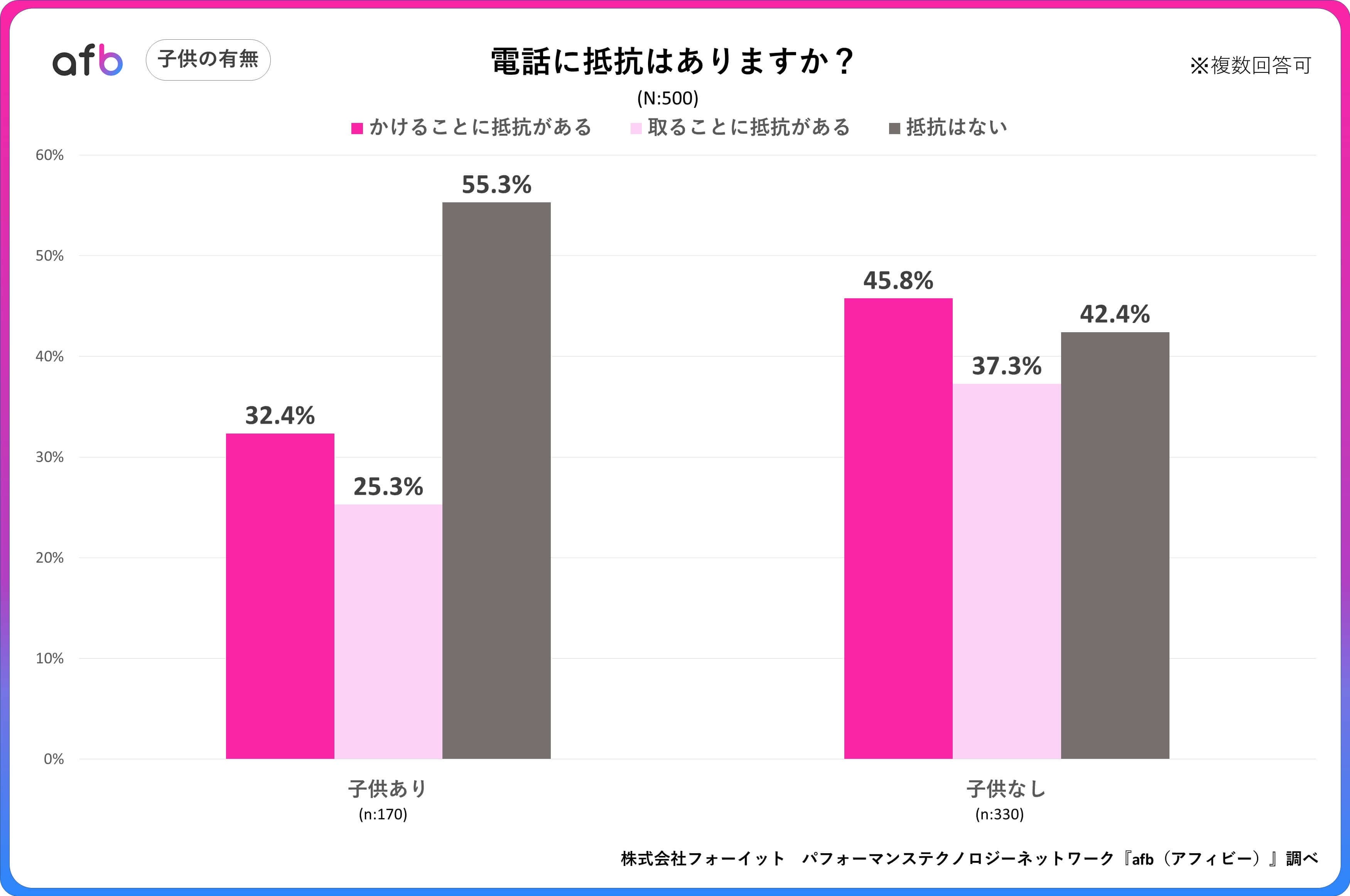 子供の有無で見ると、子供がいる方は子供がいない方と比較して電話に抵抗がある方が少ないことが分かります。子供が生まれ、さまざまな行政上の手続きをする際の自治体などのやりとりや、子供が通っている学校とのコミュニケーションなど、子供がいる場合は日常的に電話を使うことが多くなるのかもしれません。そのため、電話に抵抗を感じる方が少ないと考えられます。