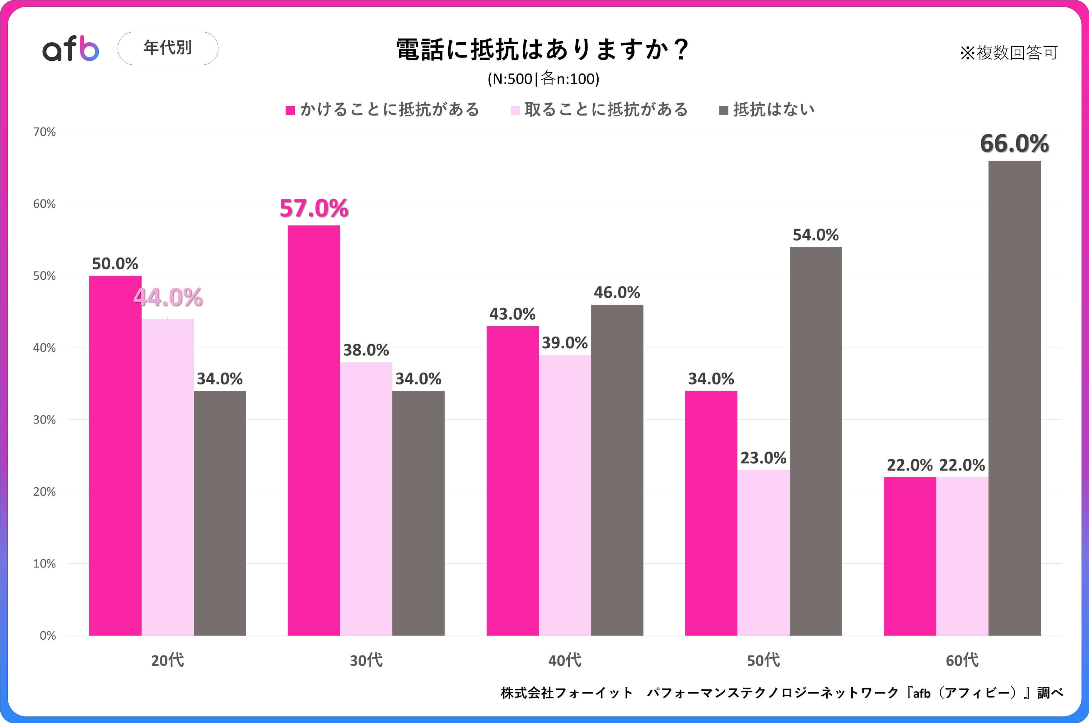 その一方で、年代が上がると、長年の経験から対応力が上がっていることなどから、電話に抵抗がない方が増えていると考えられます。