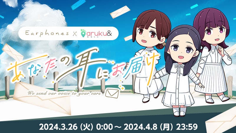繰り返す日々の《移動》をもっと楽しく価値あるものにすることを目指すウォーキングアプリ「aruku&(あるくと)」は、特別コラボ企画として声優ユニット「イヤホンズ」が2024年2月14日にNEW アルバム『手紙』の発売をしたことを記念し、「あなたの耳にお届け キャンペーン」を3月26日から4月8日まで開催します。キャンペーン期間中、「イヤホンズ」の3名がaruku&内の住民としてキャラクターで登場。全国各地にいるキャラクターに話しかけると、ウォーキングの依頼(例:1時間以内に200歩あるく)が出され、無事に達成できればサイン入りポスターやイヤホンズライブグッズセット福袋など本キャンペーン限定のグッズに応募することができます。また、好評発売中のNEWアルバム「手紙」にちなみ、全国の郵便局(※一部地域を除く)にイヤホンズのキャラクターが出現します。ランダムに出現するキャラクターの依頼を達成すると、限定グッズに応募できるカードを獲得することができます。加えて、2024年3月31日に竹芝NEW PIER HALLで開催される「イヤホンズ『手紙』トーク&コンサート」のイベント会場にあるコラボポスターのQRコードを読み取るとアプリ内で使用できるオリジナルスタンプがもらえます。また、キャンペーン期間中、指定のアニメイト店舗に足を運び配布されているチラシのQRコードを読み込むとアプリ内通貨のポタストーンが獲得でき、コラボキャンペーンをさらにお楽しみいただけます。