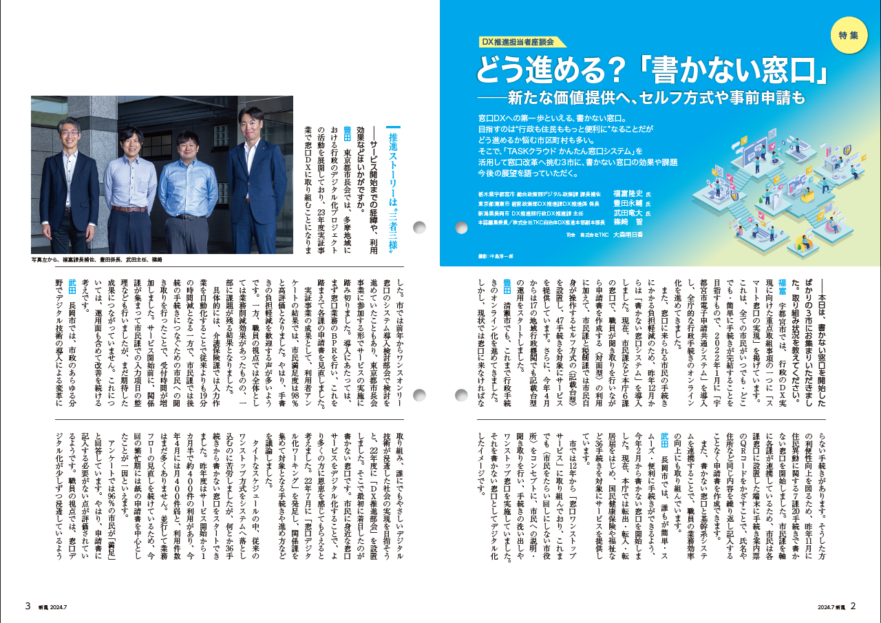 本号では、特集 座談会として、「書かない窓口」を手始めに窓口改革へ取り組む3市(栃木県宇都宮市、東京都清瀬市、新潟県長岡市)DX推進担当者にサービスの導入効果や課題、今後の展望を語っていただいたほか、最新動向として「LGWANを利用したガバメントクラウド接続」や「公金収納やキャッシュレス納付」を取り上げました。