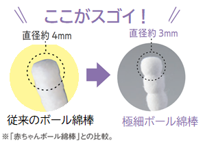 従来のボール綿棒 直径約4mmの商品から、赤ちゃんの小さな耳や鼻の穴でも見えやすくお手入れがしやすい直径約3mmのボール綿棒に改良し、新発売します。