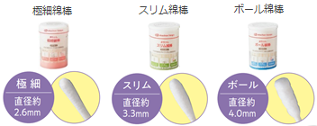 従来のボール綿棒の直径は約4mmなのに対し、今回開発したボール綿棒は直径約3mmと極細タイプに近い細さを